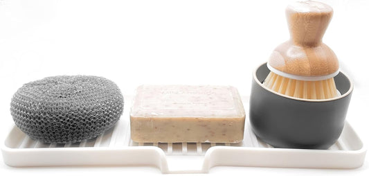 Silicone Bathroom Soap Dishes, Sponge Holder for Kitchen Sink, Shower Soap Holder with Drain, Soap Dispenser Tray, Soap Dish for Bottle, Cup, Sink or Counter Organizer - White 9" x 3.15"