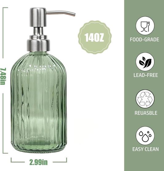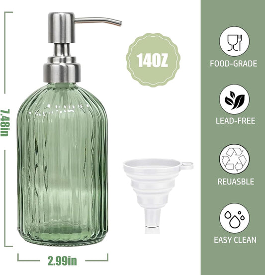 14Oz Green Soap Dispenser Bathroom, Clear Glass Hand Soap Dispensers with Stainless Steel Pump, Refillable Dish Soap Dispenser with Funnel for Kitchen, Countertop Soap Dispensers