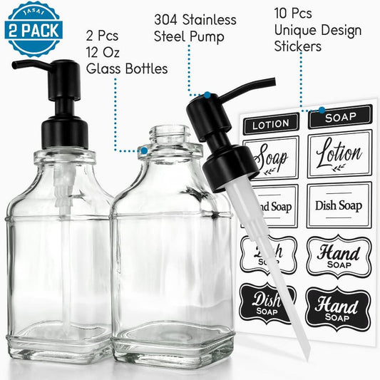 JASAI 2Pack Soap Dispenser with Rustproof Black Stain 304 Stainless Steel Pump, Stylish Hand soap Dispenser with 10Pcs Stickers, Refillable Glass Soap Dispenser for Kitchen & Bathroom.