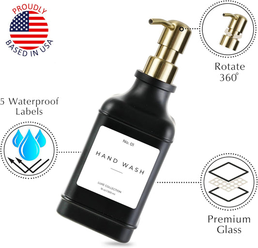 16oz Glass Soap Dispenser with Stainless Steel Pump, 21 Waterproof Labels, Non-Slip Protective Silicone Pad, Set of 2 for Bathroom & Kitchen (Matte Black Bottle/Brushed Gold Pump)