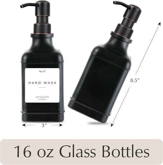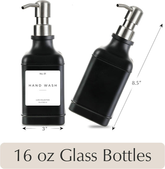 16oz Glass Soap Dispenser with Stainless Steel Pump, 21 Waterproof Labels, Non-Slip Protective Silicone Pad, Set of 2 for Bathroom & Kitchen (Matte Black Bottle/Black Pump)
