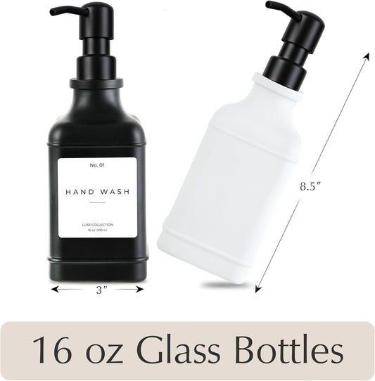 16oz Glass Soap Dispenser with Stainless Steel Pump, 21 Waterproof Labels, Non-Slip Protective Silicone Pad, Set of 2 for Bathroom & Kitchen (Matte White Bottle/Black Pump)
