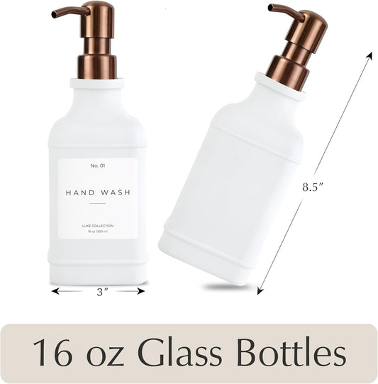 16oz Glass Soap Dispenser with Stainless Steel Pump, 21 Waterproof Labels, Non-Slip Protective Silicone Pad, Set of 2 for Bathroom & Kitchen (Matte White Bottle/Brushed Gold Pump)