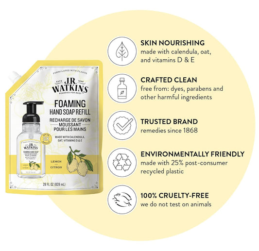 J.R. Watkins Foaming Hand Soap Refills, , Alcohol-Free Hand Wash, Cruelty-Free, , Moisturizing Hand Soap Refill for Bathroom or Kitchen, Lemon 28 fl oz Foam Soap Refill, 6 Pack