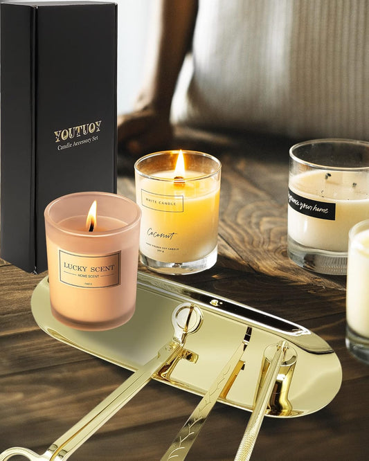 4 in1 Candle Accessory Set with Storage Tray Plate, Candle Wick Trimmer, Candle Wick Snuffer, Candle Wick Dipper, Great for Scented Candles Lovers (Gold)