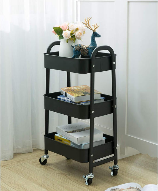 AGTEK Makeup Cart, Movable Rolling Organizer Cart, Black 3 Tier Metal Utility Cart