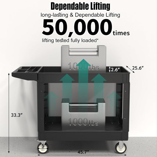 Utility Cart on Wheels, 1000 lbs Capacity Rolling Service Cart, 45 x 25 Inch Work Carts, 2 Shelf Heavy Duty Plastic Tool Cart, Lipped Shelves, for Warehouse, Garage, Cleaning, Black