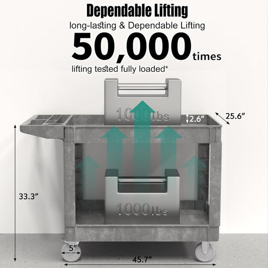 Utility Cart on Wheels, 1000 lbs Capacity Rolling Service Cart, 45 x 25 Inch Work Carts, 2 Shelf Heavy Duty Plastic Tool Cart, Lipped Shelves, for Warehouse, Garage, Cleaning, Gray