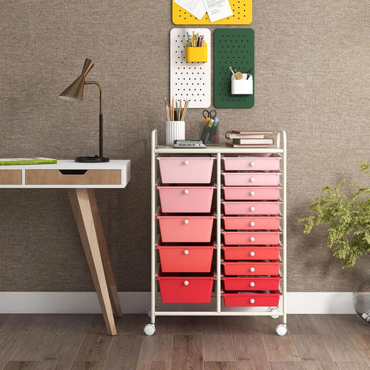 GOFLAME 15-Drawer Rolling Storage Cart, Multipurpose Movable Organizer Cart, Utility Cart for Home, Office, School, Pink