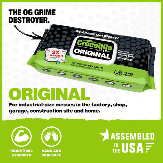 Crocodile Cloth Original Cleaning Wipes – 50 (15” x 10”) Hand & Tool Industrial Cleaning Wipes – Large Multi-Surface Cleaning Cloths, Water-Based Solution with Extreme Cleaning Power — Safe on Skin