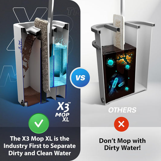 X3 Mop XL, Separates Dirty and Clean Water, 3-Chamber Design, Flat Mop and Bucket Set, Hands Free Home Floor Cleaning, 3 Reusable Microfiber Mop Pads Included