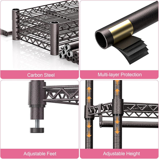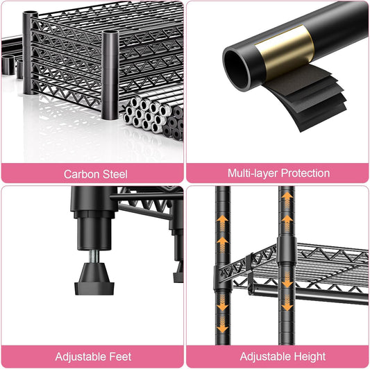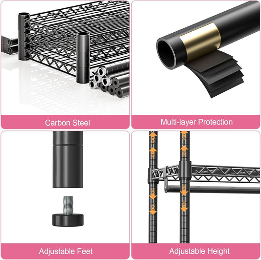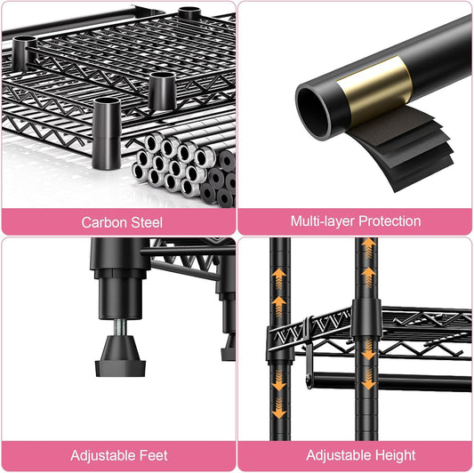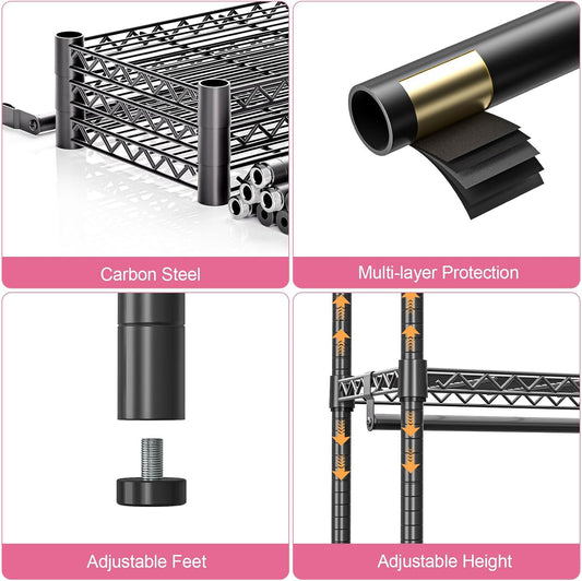 Heavy Duty Rolling Garment Rack 4 Tiers Adjustable Wire Shelving Clothes Rack with Rods and Side Hooks, Storage Closet Clothing Rack with Wheels Black 17.7" D x 47.2" W x 83.6" H