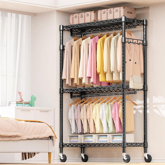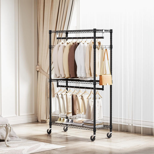 Heavy Duty Rolling Garment Rack 3 Tiers Adjustable Wire Shelving Clothes Rack with 2 Rods and Side Hooks,Storage Closet Clothing Rack with Wheels Black 15.7" D x 45.3" W x 79.6" H