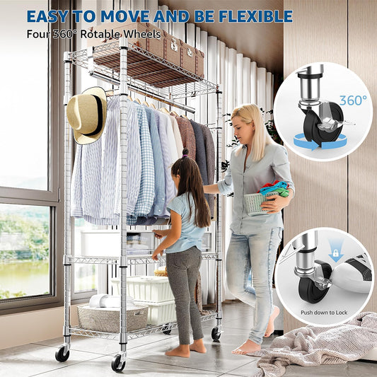 Heavy Duty Rolling Garment Rack 3 Tiers Adjustable Wire Shelving Clothes Rack with 1 Rods and Side Hooks,Storage Closet Clothing Rack with Wheels Chrome 15.7" D x 45.3" W x 75.6" H