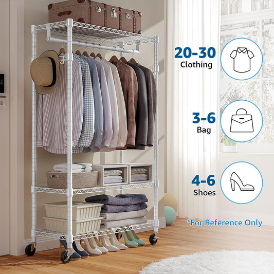 Heavy Duty Rolling Garment Rack 3 Tiers Adjustable Wire Shelving Clothes Rack with 2 Rods and Side Hooks,Storage Closet Clothing Rack with Wheels White 15.7" D x 29.5" W x 74.5" H