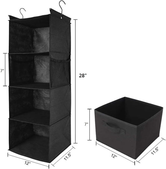 MAX Houser 4-Shelf Hanging Closet Organizer, Space Saver, Cloth Hanging Shelves with 2 Side Pockets, Foldable (Black)