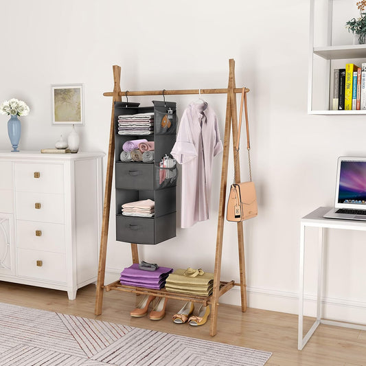 MAX Houser 5 Shelf Hanging Closet Organizer, Space Saver, Cloth Hanging Shelves with 4 Side Pockets, Foldable, Grey