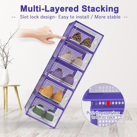 Kuject Shoe Organizers Storage Boxes for Closet, 12 Pack Clear Plastic Stackable Storage Bins with Lids, Under Bed Shoe Containers for Entryway, Drop Front, Fit up to Women's Size 10,Purple