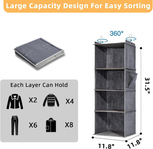 2 Packs Hanging Closet Organizer, 4-Shelf Closet Organizers and Storage with Side Pockets, Collapsible Hanging Shelves for Closet & RV & College Dorm,Grey