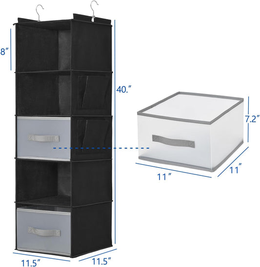 5-Layer Suspended Fabric Shelf Organizer, Equipped with 2 Sturdy Hooks, 2 Separate Drawers, and Foldable Hanging Storage (Black)