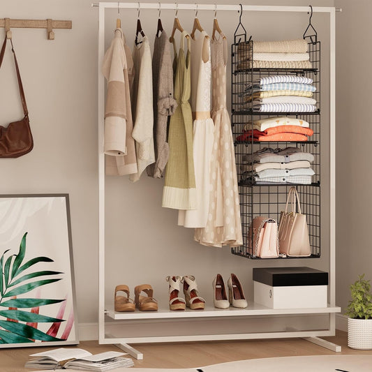 X-cosrack Hanging Closet Organizer and Storage - 5-Tier Closet Storage Organizer Baskets for Clothes & Adjustable Collapsible Metal Closet Hanging Organizer Shelves for Sweaters Shoes Handbags