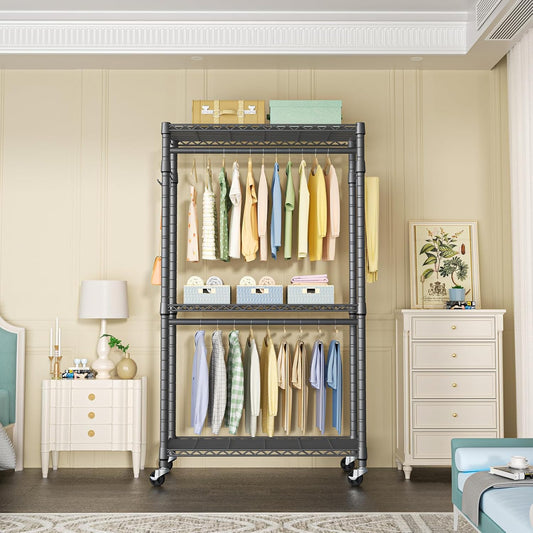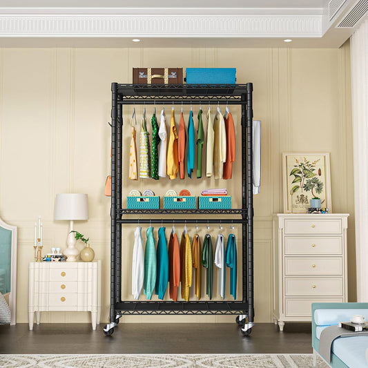 FUTASSI P1 Heavy Duty Garment Rack, 3 Tiers Adjustable Rolling Metal Closet Organizer with Lockable Wheels, FreeStanding Wardrobe with Double Hanger Rods & 1 Pair Hooks, Max Load 450 LBS, Black