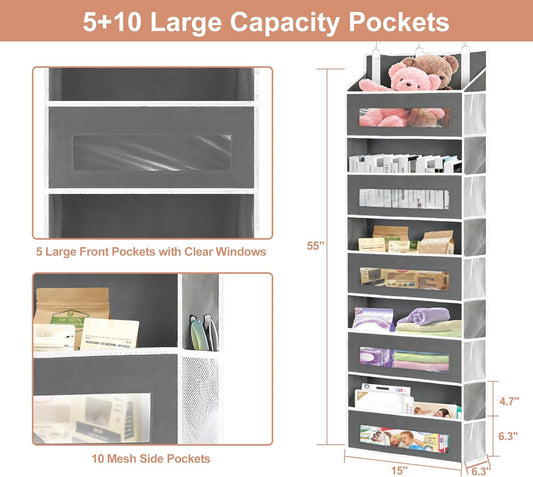 Over The Door Organizer - Over Door Storage Organizer with 5 Large Pockets & 10 Mesh Side Compartments - Heavy-Duty Hanging Storage for Bathroom, Bedroom & Closet - Baby Room Organize Solution