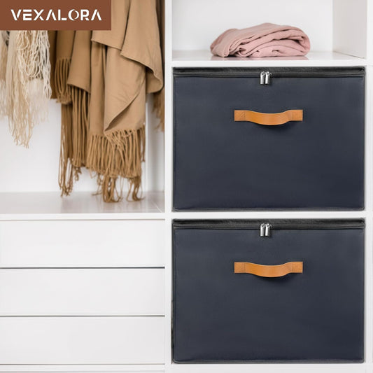 Vailando Under Bed Storage Containers, Foldable Storage Bins for Blankets, Comforter, and Seasonal Clothing, 6 Inches Tall, Beige with Brown Leather Handles, 2-Pack