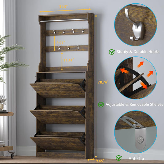 Shoe Cabinet with 3 Flip Drawers & Coat Rack, Narrow Hidden Shoe Storage Cabinet, 2-in-1 Hall Tree Slim Freestanding Shoe Rack Organizer for Entryway, Hallway, and Living Room