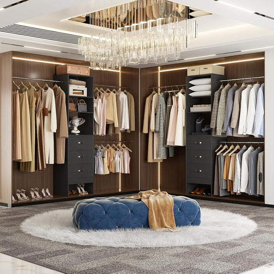 96'' Closet Organizer System with 3 Hanging Rods (Without 3 Storage Shelves), 8FT Closet Systems, Wall Mount Bedroom Wardrobe with 3 Wood Drawers, Adjustable Garment Rack from 5 to 8FT, Black
