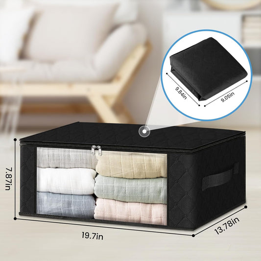 HomeHacks Storage 4-Pack Clothes Organizer Storage Bags Foldable Storage Box with Large Clear Window Sturdy Handles for Closet, Dorm, Pillows, Bedding, Clothes, Blankets, 35L, Black