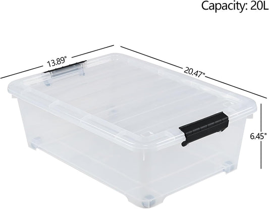 20 Quart Stackable Plastic Under Bed Bins with Lid, Set of 4 Clear Latch Storage Container with Wheels
