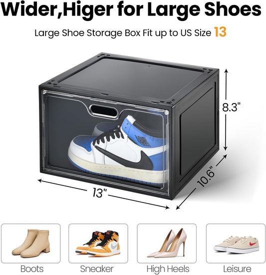 10 Pack Shoe Boxes Stackable,Upgraded Sturdy Storage Boxes with Clear Magnetic Door,Multifunctional Sneaker Organizer Fit up to US Size 12 (13.8”x 9.84”x 7.1”)