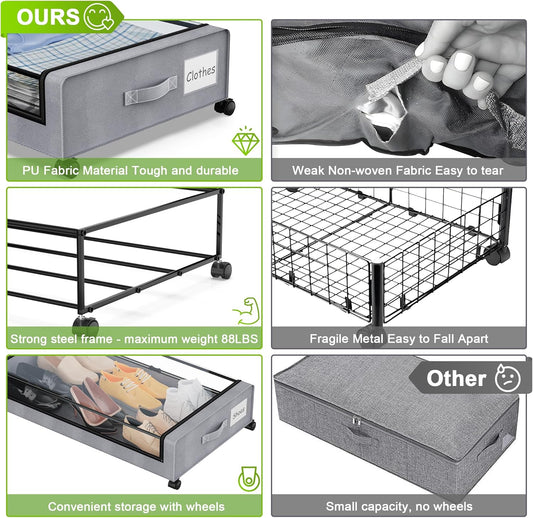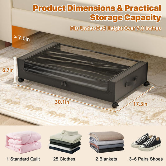 Under Bed Storage with Wheels,Under Bed Storage Containers with Clear Lids, Under-Bed Organizers for Clothes, Shoes – Durable Storage Bins with Smooth Rolling Wheels (Black, 4 Pack)