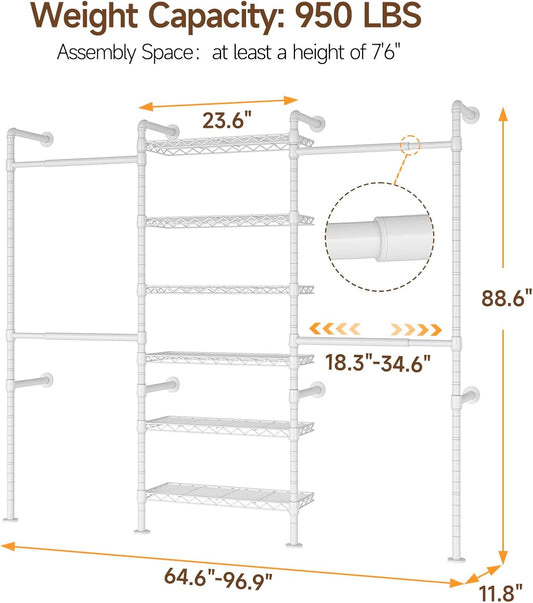 ONBRILL H3 Wall Mounted Closet System, Expandable Industrial Pipe Clothes Rack Clothing Rack for Hanging Clothes, Heavy Duty Closet Organizers and Storage in Wardrobe Closet, White