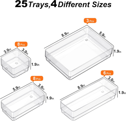 SMARTAKE 25-Piece Drawer Organizer with Non-Slip Silicone Pads, 4-Size Desk Drawer Organizer Trays Storage Tray for Makeup, Jewelries, Utensils in Bedroom Dresser, Office and Kitchen (Clear)