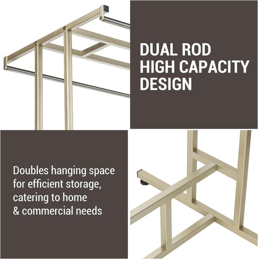 MyGift 4ft Tall Brass Tone Stainless Steel Freestanding Garment Rack, Heavy Duty Double Rod Clothes Closet Stand, Coat Dress Clothing Storage Display Shelf