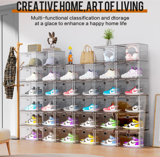 12 Pack Acrylic Shoe Boxes, Ultra Clear Shoe Boxes Stackable, Shoe Storage Box Sneaker Storage for Sneakerhead, Foldable Shoe Organizer with Magnetic Door, Professional Shoe Display Fits US Size 15