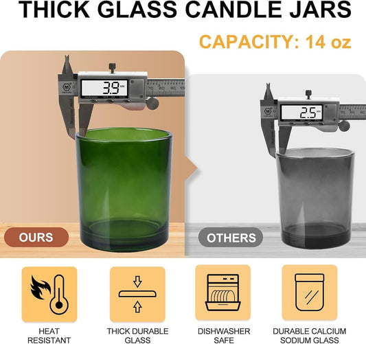 14 OZ Thick Candle Jars for Making Candles 12 Pcs, 3 Wick Empty Jars with Wood Lids for Candle Making, Sample Container,Clear Green