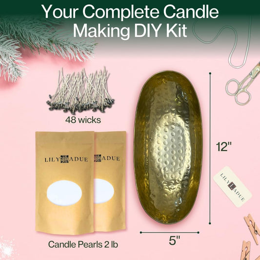LILY LADUE Candle Refill Kit - 2Lb/32Oz Pearled Candles Sand and Wicks (48) and Hammered Bronze Holder, Reusable Unique Sand Candles with Wicks for Candle Making, Bulk Unscented Pearl Wax Beads