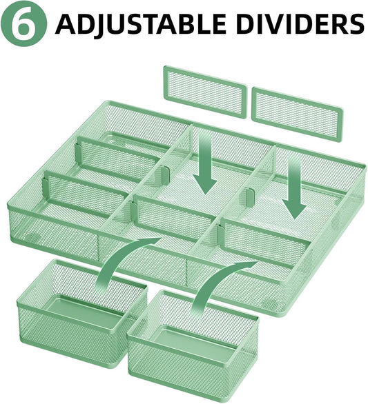 Marbrasse 3 Packs Desk Drawer Organizers, Metal Mesh Dividers with 9 Adjustable Compartments, Pen Organizer for Drawer Tray Box Accessories for Desktop,Kitchen, Makeup(Green)