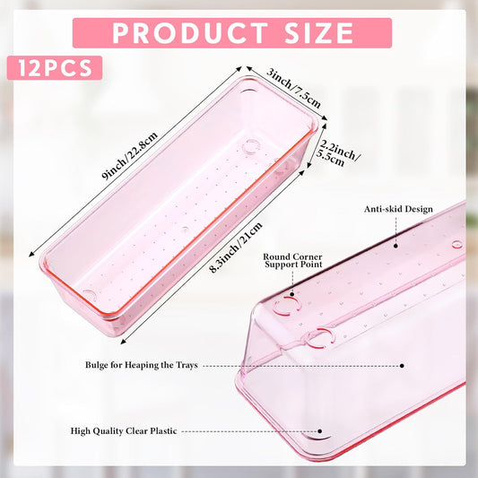 Maitys 12 Pcs Vanity Drawer Organizer 9 x 3 x 2 Inches Clear Plastic Utensil Organizers Kitchen Drawers Dividers for Office Desk Silverware Kitchen Utensils Cosmetics and Bathrooms(Pink)