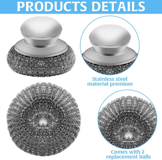 Scrubber with Handle Comes with Three Replacement Balls Steel Wool, Short Handle Scrubber, Steel Wool Scrubber Supplies Dish Scrubber, Stainless Steel Scrubber Tool Metal Scrubber for Dishes