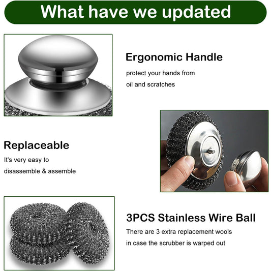 Steel Wool Scrubber with 2 Handles & 3 Replacement Wire Sponge(Scouring Pads) - Stainless Metal Cleaner Heavy Duty Brush for Pots, Pans, Cast Iron, Grill, Sink, Dishes, Stove, Kitchen Deep Clean