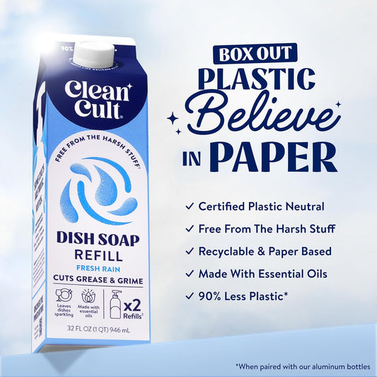 Cleancult Dish Soap Liquid Refill (32oz, 3 Pack) - Plant Based Cleaning Power - Dish Soap that Cuts Grease & Grime - Free of Harsh Chemicals - Uses 90% Less Plastic - Fresh Rain