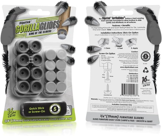 GorillaGlides CB193 3/4 Inch Chair Glides/Furniture Feet Floor Protectors (Set of 16 Sliders) Self-Adhesive Screw-On Glides for Sliding on Hard Surface Flooring and Low-Pile Carpet, Round
