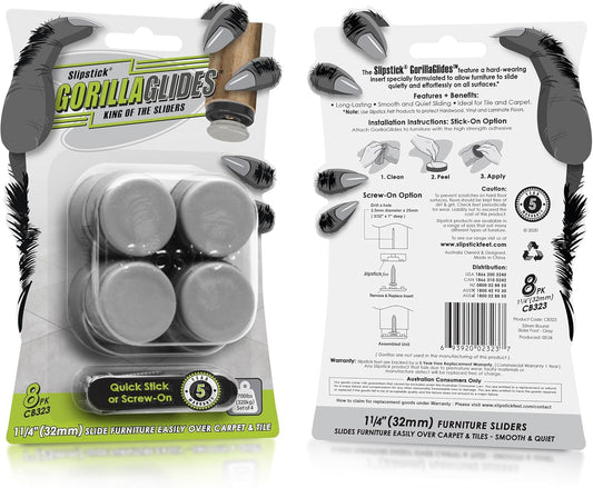 GorillaGlides CB323 1-1/4 Inch Furniture Sliders/Chair Glide Floor Protectors (Set of 8 Glides) Self-Adhesive Screw On Furniture Glides for Low Pile Carpet and Hard Surface Flooring, Round
