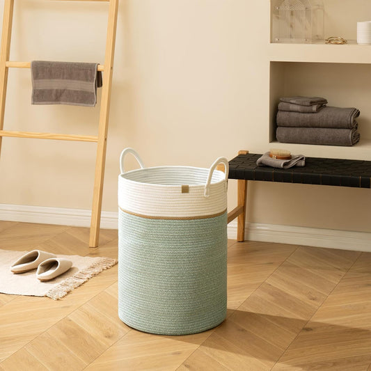 Cotton Rope Laundry Basket Hamper for Clothes Woven Storage Basket for Living Room Bedroom Boho Tall Rope Baskets for Blanket Toys Pillow Towels Baby Nursery Hamper Bin Large light green