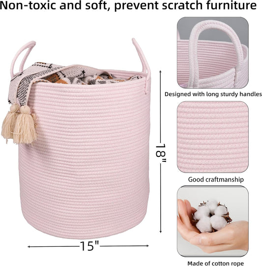 Cotton Rope Laundry Basket Hamper for Girls Kids Baby Nursery Hamper Bin Woven Storage Basket for Living Room Girls room Boho Tall Rope Baskets for Blanket Toys Large light pink