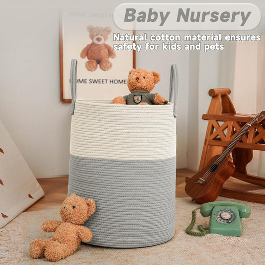 Large Woven Laundry Basket Hamper,80L Cotton Rope Storage Bin for Blankets,Toys and Clothes,Decorative Tall Nursery Hamper for Living Room,Baby Nursery,Bathroom and Bedroom,White and Grey